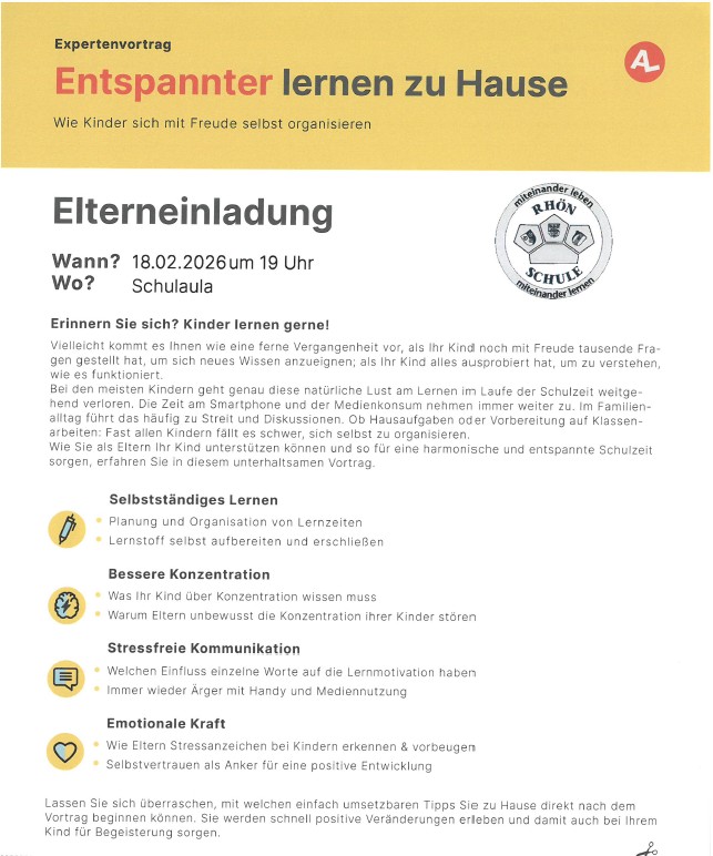 am 18.02.2026 findet in der Schulaula um 19 Uhr ein interessanter Vortrag zum Thema "Entspannter lernen zu Hause - Wie Kinder sich mit Freude selbst organisieren" statt.