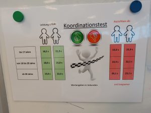 Nachdem der dazu notwendige Parcours gemeinsam mit dem Arbeitscoach in der Sporthalle aufgebaut sowie genau eingemessen war, konnte pünktlich zum Unterrichtsbeginn die Klasse 9R mit diesem anspruchsvollen Test beginnen. Natürlich wurde zuerst mit verschiedenen Erwärmungsübungen unter Anleitung der Sportlehrkraft Frau Herold gestartet.