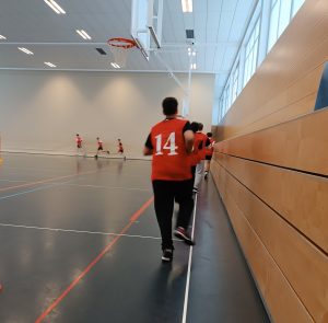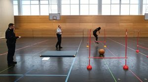 Nachdem der dazu notwendige Parcours gemeinsam mit dem Arbeitscoach in der Sporthalle aufgebaut sowie genau eingemessen war, konnte pünktlich zum Unterrichtsbeginn die Klasse 9R mit diesem anspruchsvollen Test beginnen. Natürlich wurde zuerst mit verschiedenen Erwärmungsübungen unter Anleitung der Sportlehrkraft Frau Herold gestartet.