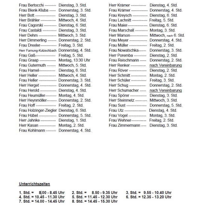 Die Sprechzeiten von nicht verzeichneten Lehrkräften können sie im Sekretariat erfragen.